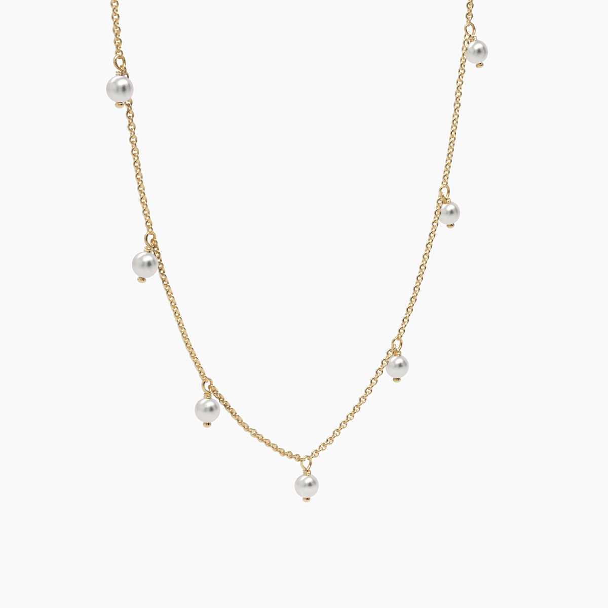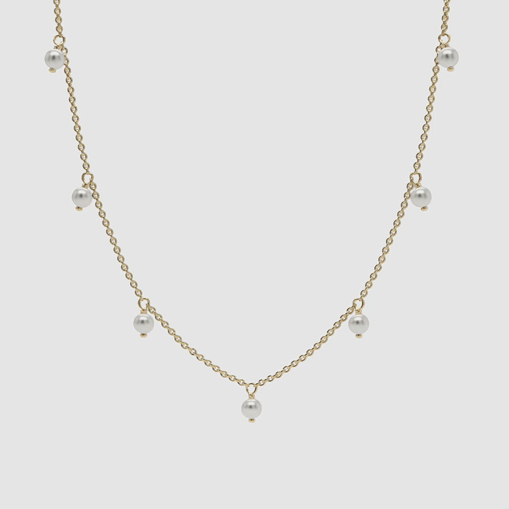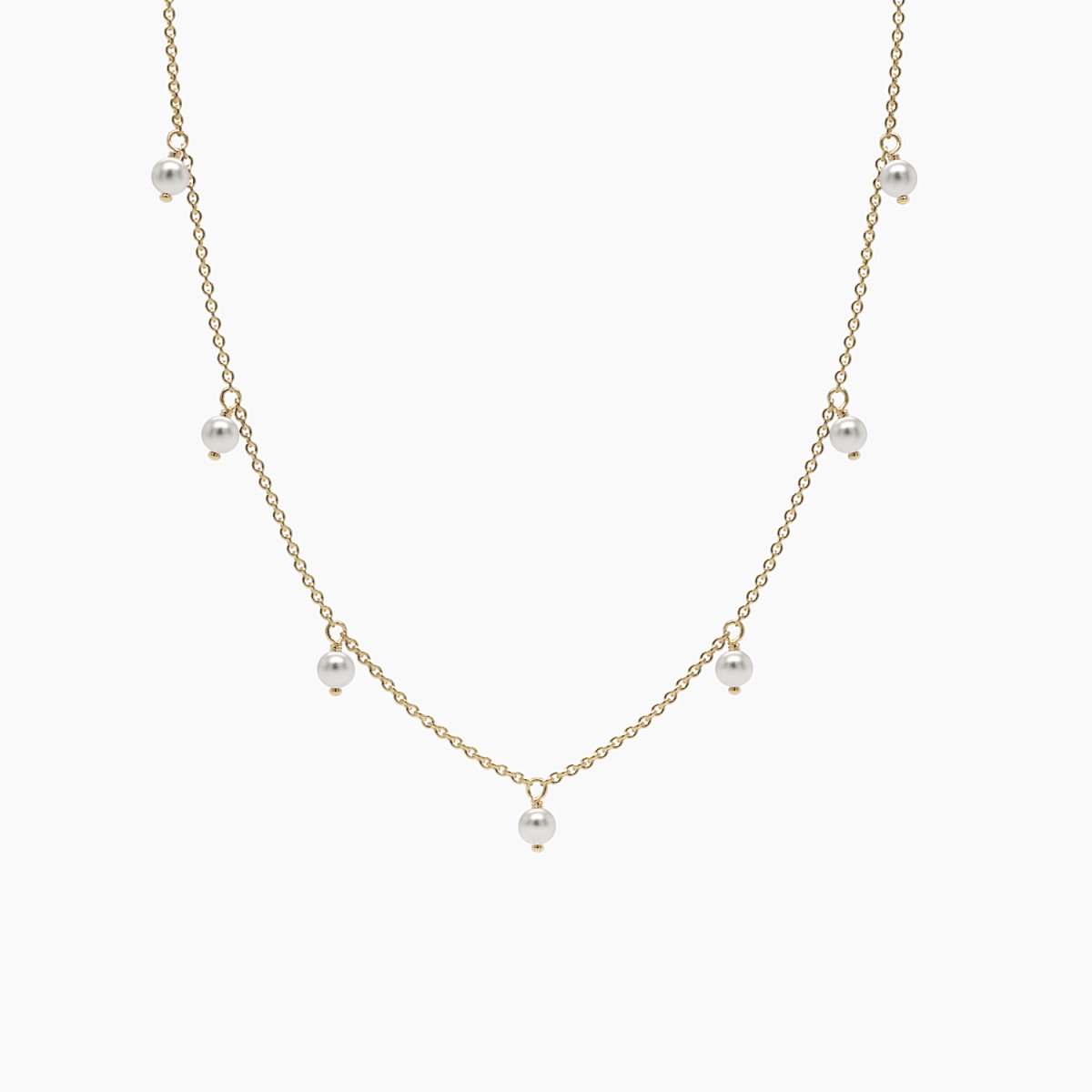 Tiny yet effortlessly charming, seven white pearls dangle from a 14k yellow gold chain, making a minimalist chic statement on your collarbone. Sturdy and lightweight enough for daily everywear, it also serves as a lovely gift to honor personal achievements and unique occasions.