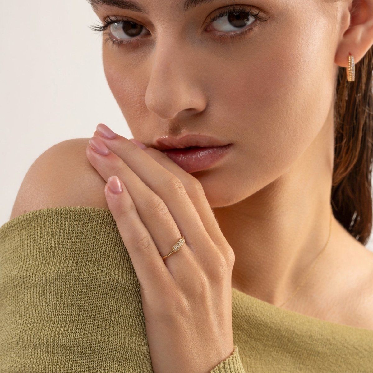 Crafted from enduring 14k gold and adorned with a row of sparkling pavé-set diamonds, this exquisite Dainty Pavé Diamond Ring radiates the right amount of shimmer for both everyday wear and special occasions. Wear it alone or stacked with other minimal bands for a chic, layered look.