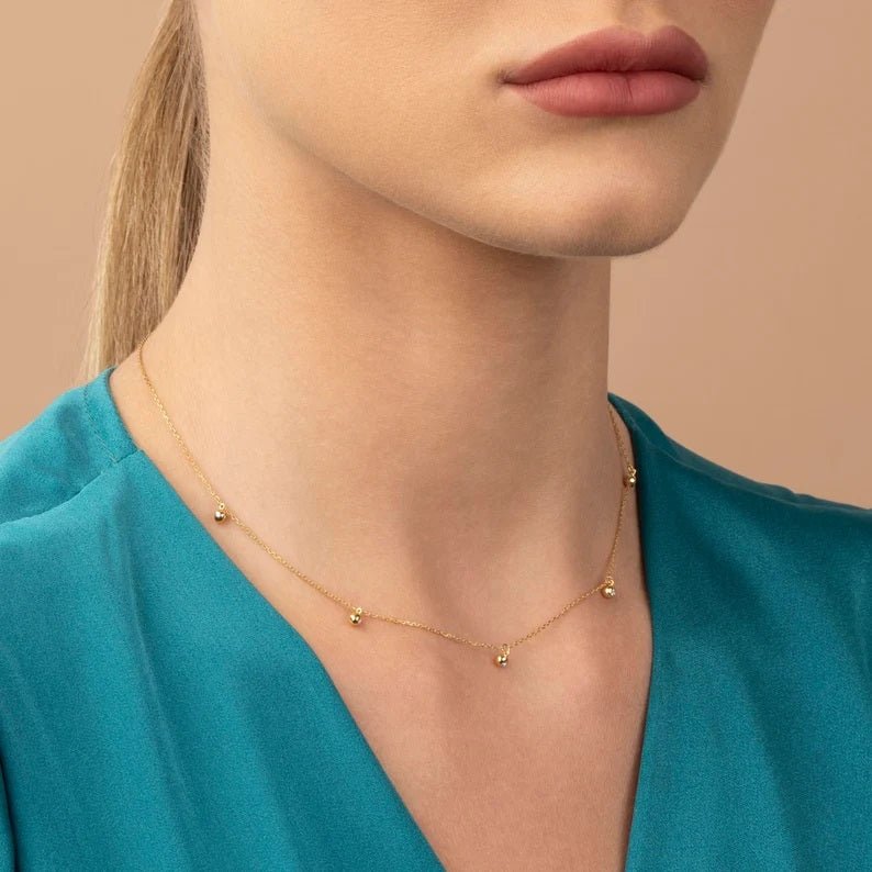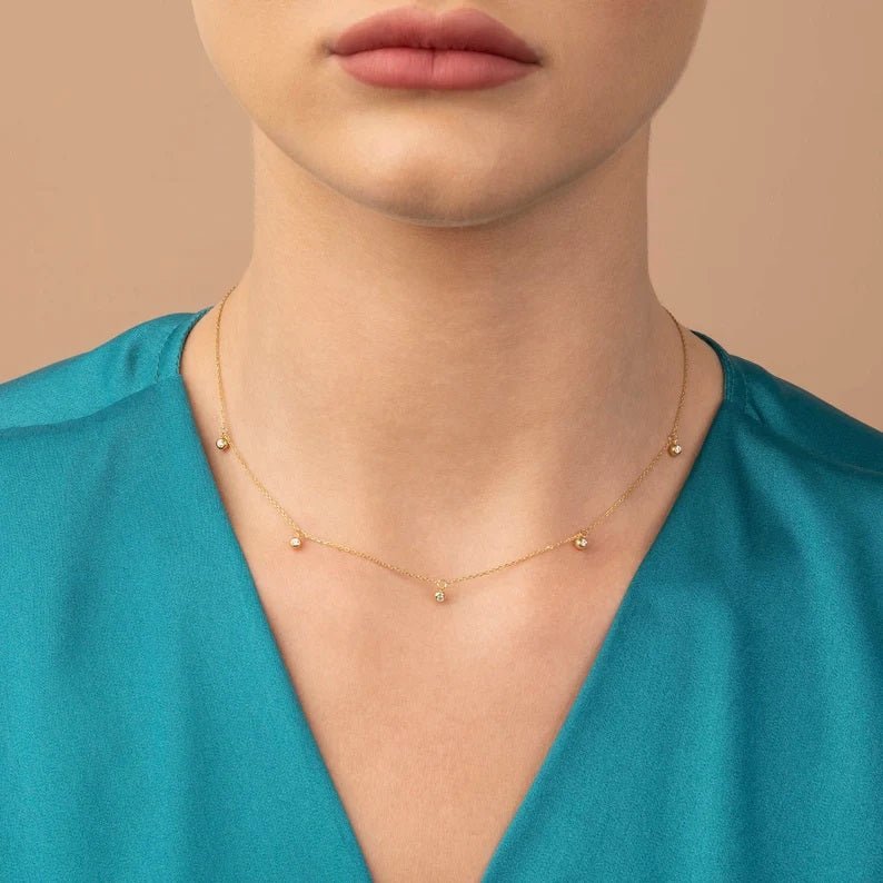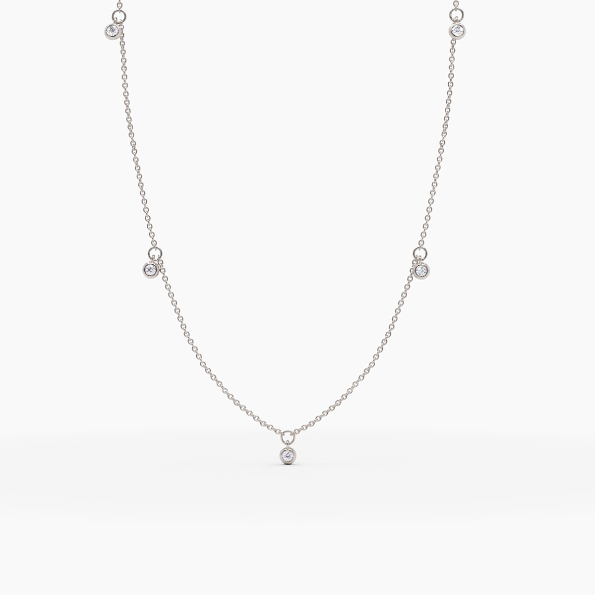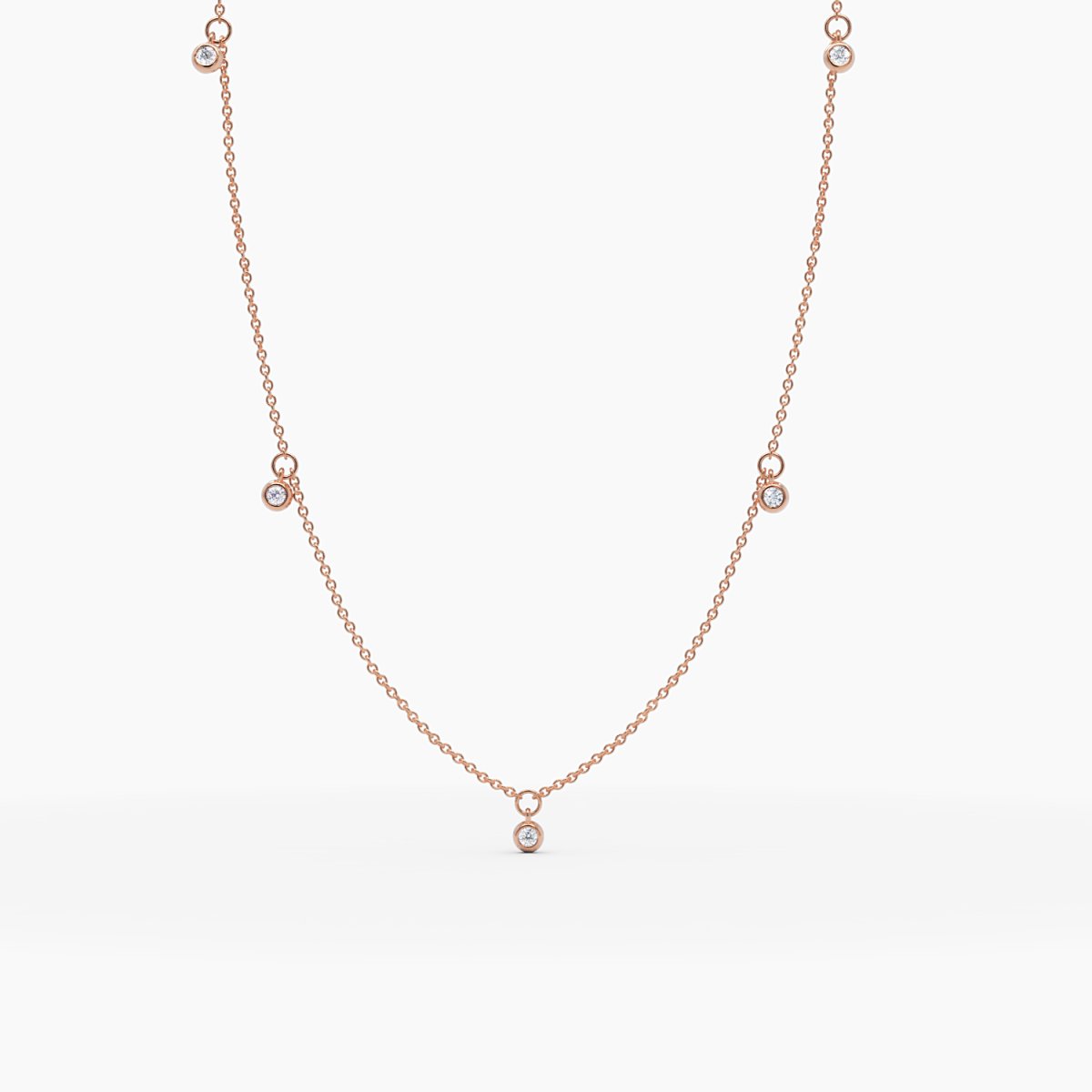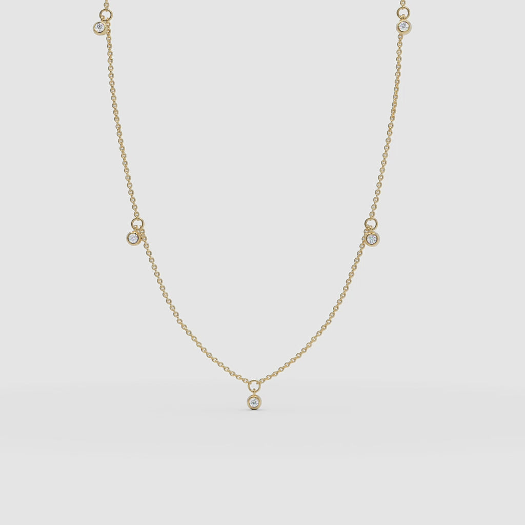 A timeless station necklace featuring bezel-set diamonds hanging from a cable chain, crafted in 14k gold to resist tarnish and stand a lifetime of graceful wear. A stand-alone pice you'll love to style solo or use as a building block for all your fine gold stacks.