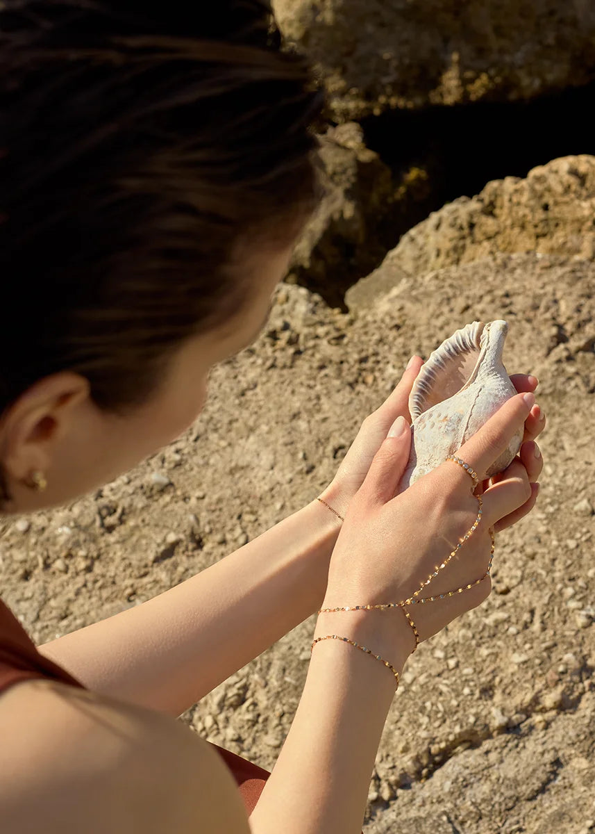 Distinctive and graceful, a hand chain designed to quietly follow your hands' natural flow, blending classic elegance with contemporary flair. Crafted with durable 14k gold to preserve its shine over the years, a jewelry statement you'll love admiring on your wrist daily.