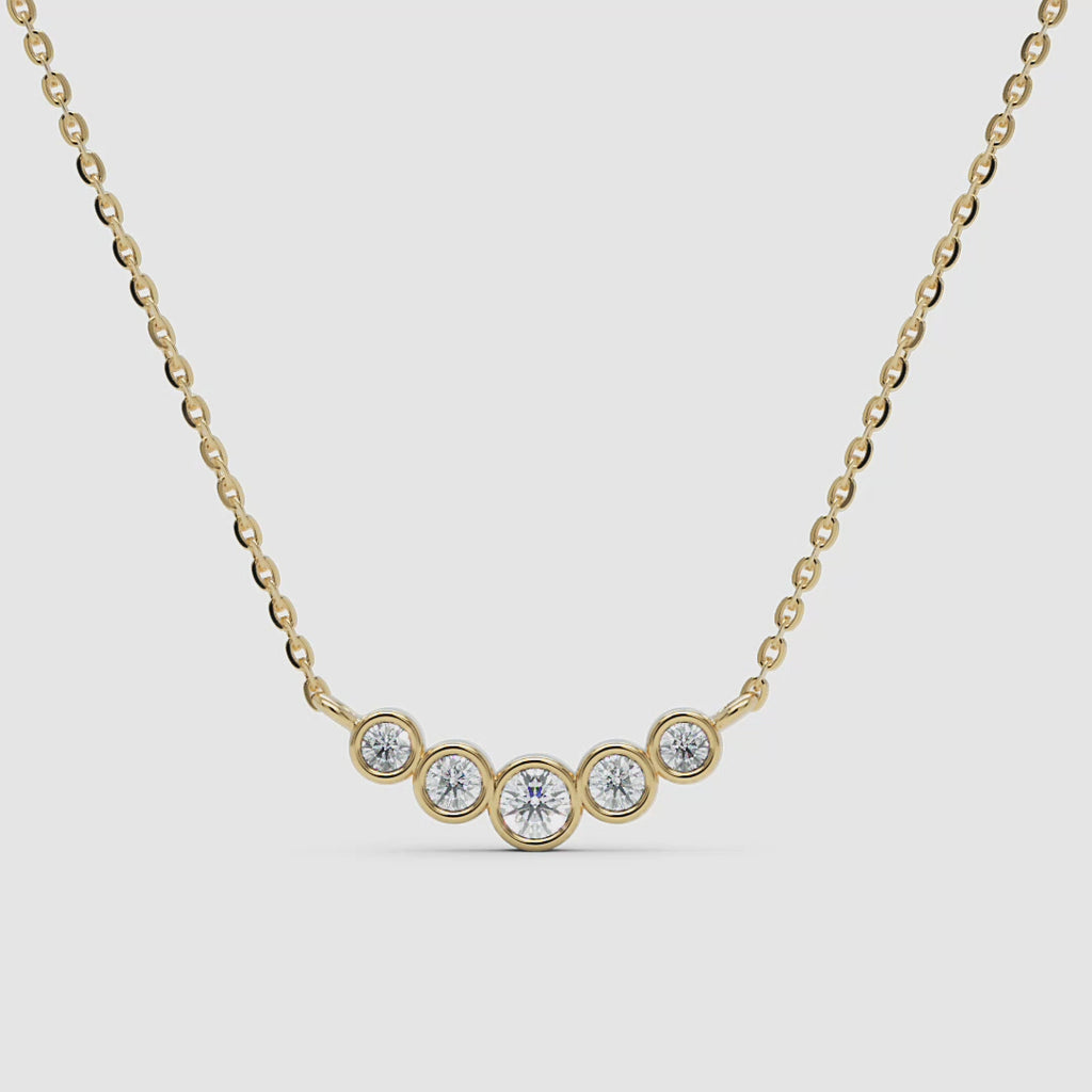 Sustainable gold and real white diamonds never looked prettier together! 5 bezels follow a subtly curved shape on a solid gold chain to create an irresistibly elegant piece. Add a bit of shine to your neck or make this Dainty Diamond Bezel Bar Necklace a lovely gift to your special someone.