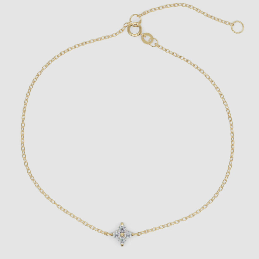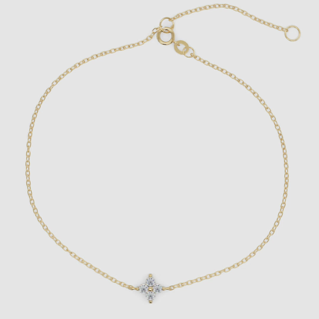 Unapologetically romantic and with a lightweight feel, the Diamond Flower Bracelet is meant to add minimalist charm to any ensemble or stack. Four tiny diamonds assemble a four-leaf flower for a subtle sparkle on your wrist. Crafted in 14k solid yellow gold to last and be treasured for years.