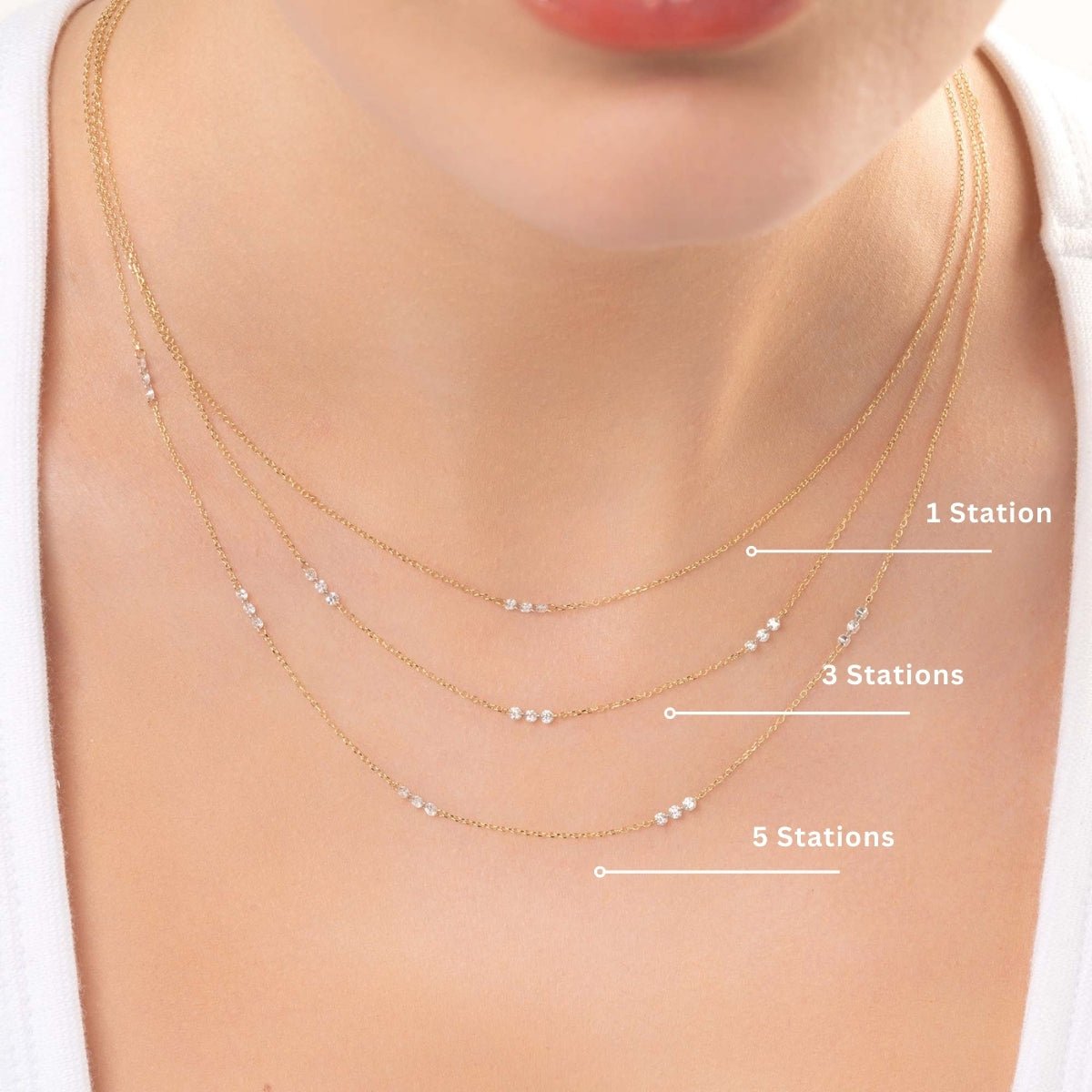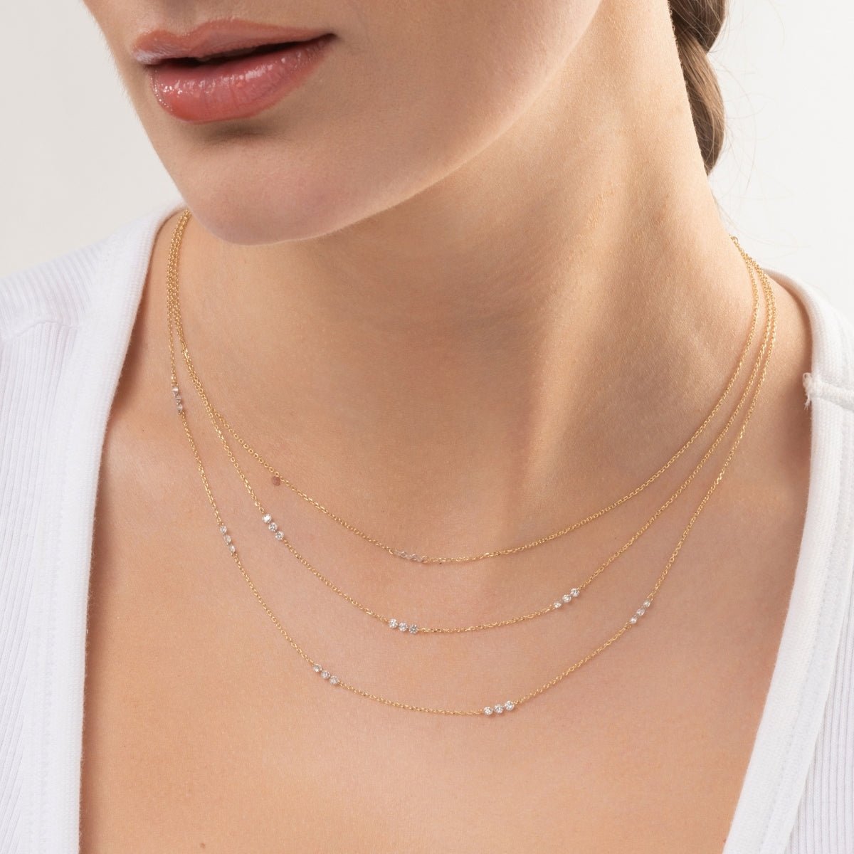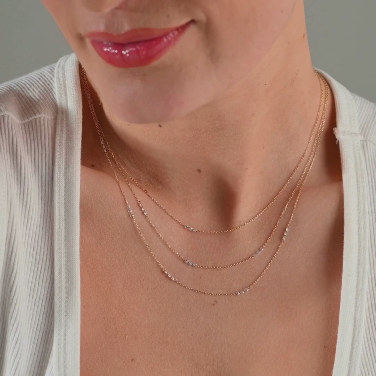 A subtle yet radiant touch for any look: our Drilled Diamond Station Necklace. Shimmering drilled diamonds, arranged in sets of three, adorn a fine 14k white gold cable chain. Perfect for complementing your go-to stacks without overpowering them.