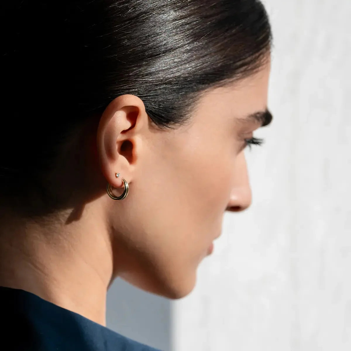 A pair of sleek 14k gold hoops that appear to be united into one piece, designed to feel weightless and be kept for life. Medium-sized for versatility, they quietly slip into any style—solo or combined with bolder hoops, huggies, and simple studs.