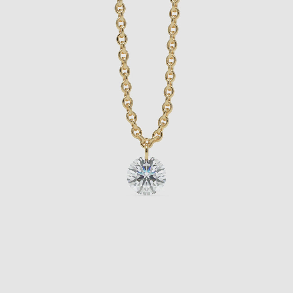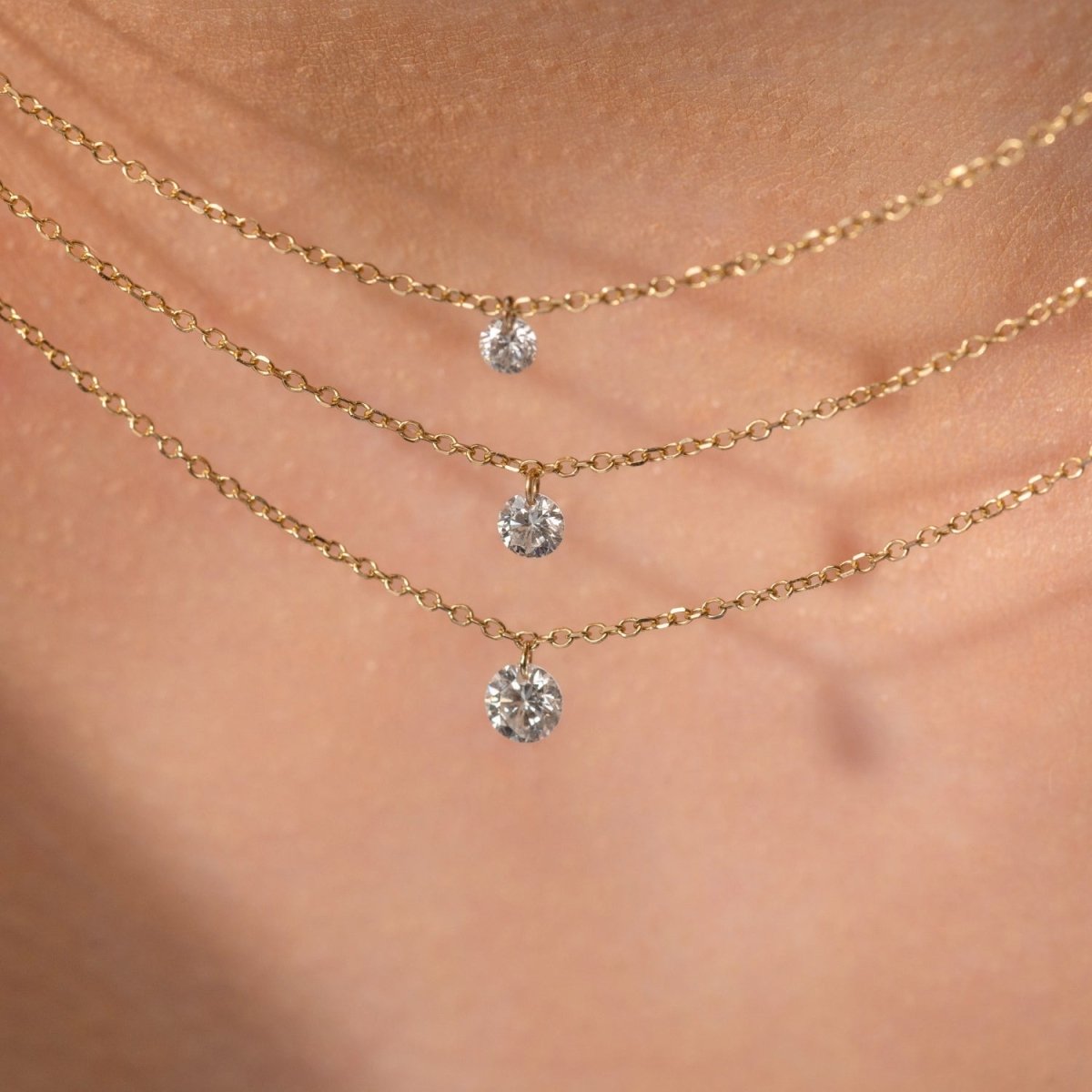 A nude diamond, expertly drilled to reflect light from every angle, levitates from a durable 14k yellow gold chain for a minimalist yet radiant statement on your neck. Available in three diamond sizes to fit any style, taste, and budget, and with adjustable chain options that allow for effortless layering.