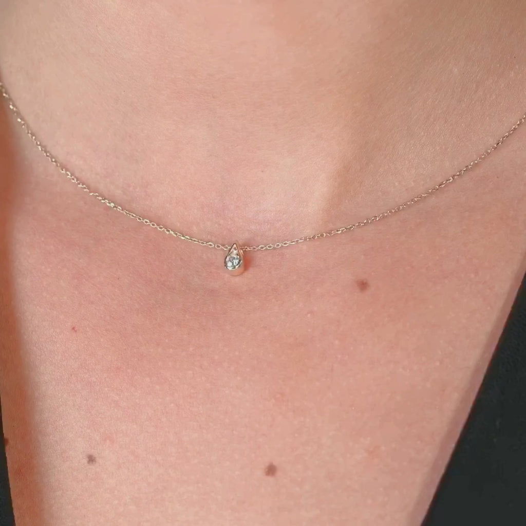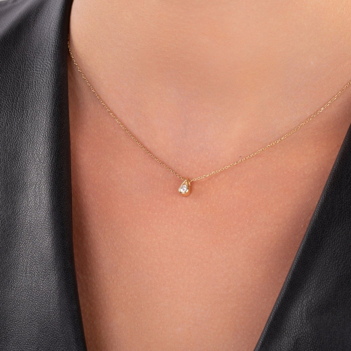 A round-cut diamond set in a teardrop gold frame is created to look as if it’s floating. The weightlessness of the necklace makes it perfect to pair with any outfit, while the sturdy 14k yellow gold chain makes this dainty piece durable enough for everyday wear.