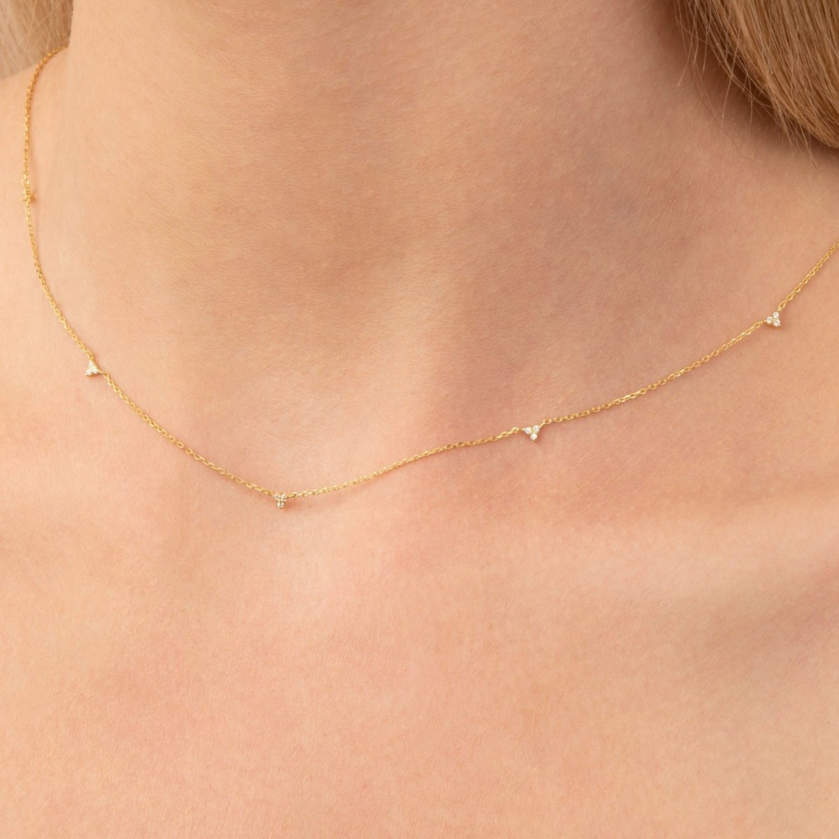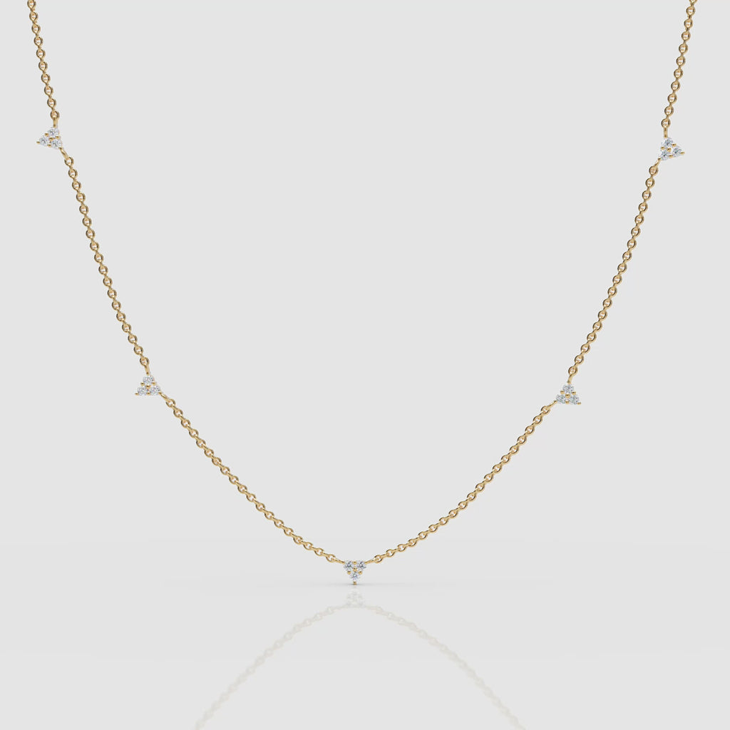 A timeless necklace that captures the sentiment of less is more—our Trio Diamond Station Necklace. Handmade with solid 14k gold and set with fifteen diamonds, it strikes the right balance between sparkle and subtlety, whether worn alone or paired with other chains.